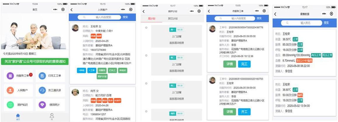 養(yǎng)老服務(wù)企業(yè)針對(duì)部分有特殊需求的老年人上門(mén)提供"準(zhǔn)"養(yǎng)老院的生活照料服務(wù)、護(hù)理服務(wù)和醫(yī)療服務(wù)等,還可以在老人家中安裝物聯(lián)網(wǎng)環(huán)境監(jiān)測(cè)探頭、智能健康監(jiān)測(cè)設(shè)備等,對(duì)居家老人進(jìn)行24小時(shí)安全自動(dòng)值守。服務(wù)企業(yè)通過(guò)"居家照護(hù)運(yùn)營(yíng)管理系統(tǒng)"對(duì)機(jī)構(gòu)客戶、員工、服務(wù)進(jìn)行管理,老人家屬通過(guò)"家護(hù)通"接收?qǐng)?bào)警信息。